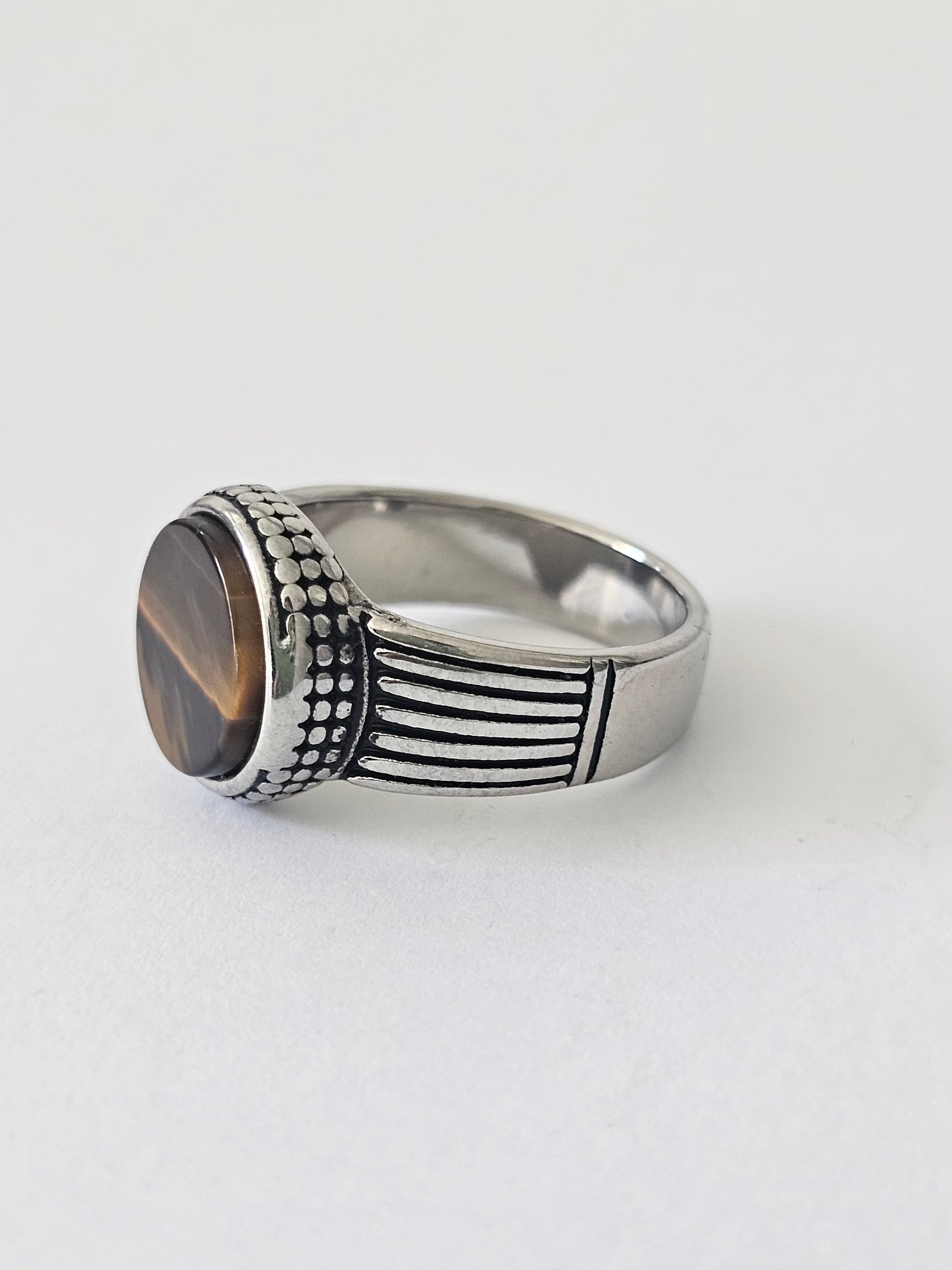 El anillo Tiger's Instinct es un tributo a la intuición y la fuerza interior. Con su piedra de ojo de tigre, este diseño captura la esencia de la naturaleza salvaje y la sabiduría ancestral, perfecto para hombres que confían en su instinto y brillan con luz propia.